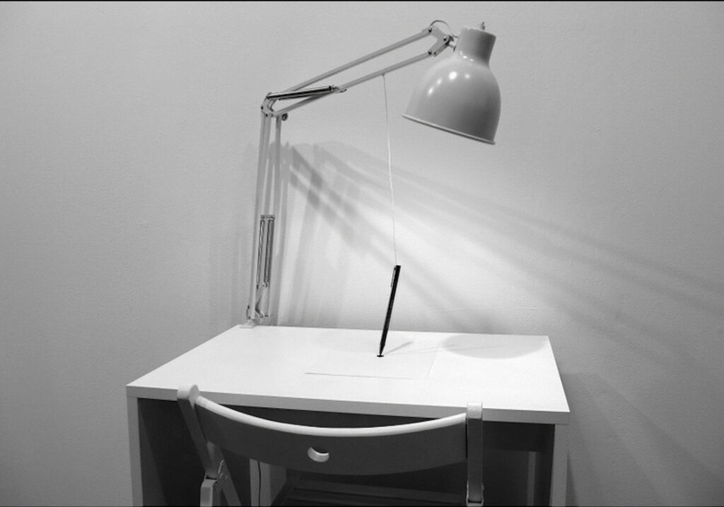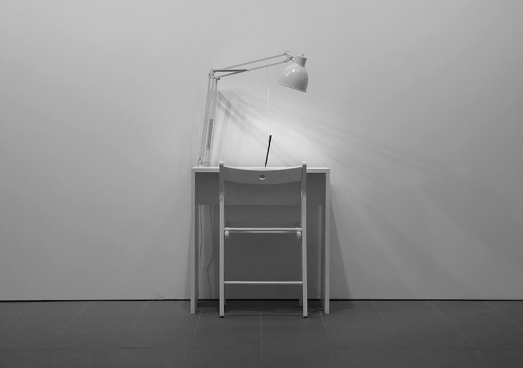 Installation — table, table lamp, felt-tip pen, paper, chair