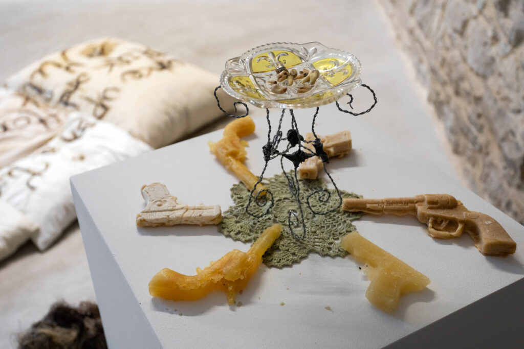 In the small space of Manuš Gallery, the artist stages a scene in which friendly teddy bears – icons of childhood trust – turn into guardian-traitors and mischievous accomplices of the ominous, invisible protagonist. Their softness is no longer neutral; made of polyurethane foam and various sticky substances, their repulsive appearance is ironic and unmistakably dangerous. They guard a pedestal holding objects that appear both fragile and threatening: weapons made of sugar, a material that symbolizes sweetness but, under the pressure of a hand, reveals its potential for harm. Nearby, collected teeth are displayed like a forensic inventory, a catalog of what was once alive, organic, part of a body, now functioning as evidence of an unspoken, unknowable, painful history. This forensic aspect of the installation creates psychological tension: the space the viewer enters seems to hold the echoes of suppressed screams that have long since become tangible, evident, almost documentary. This psychophysical register of discomfort is further intensified by video footage of teeth, cast from the same sugary material, being spat out. This act, artificial and visceral at once, amplifies the sense of unease. The video functions as a micro-performance of internal erosion, a visualization of the moment when fantasy sheds its protective shell to expose its underlying vulnerability. It also introduces a somatic inversion, presenting a body that communicates through its own disintegration, through expulsion, through symptom rather than language. Thus, the fantastical register of the story is refracted through the materiality of the oral cavity – a site where both language and pain are formed.