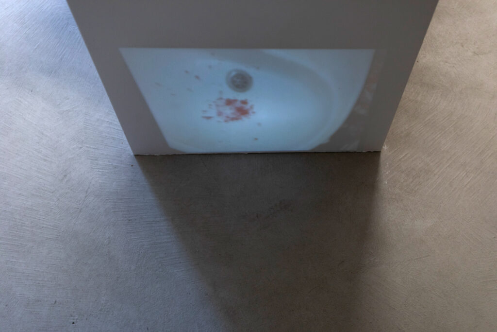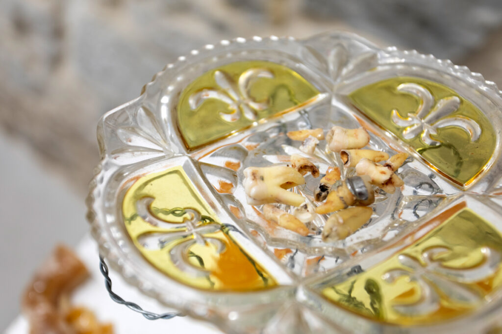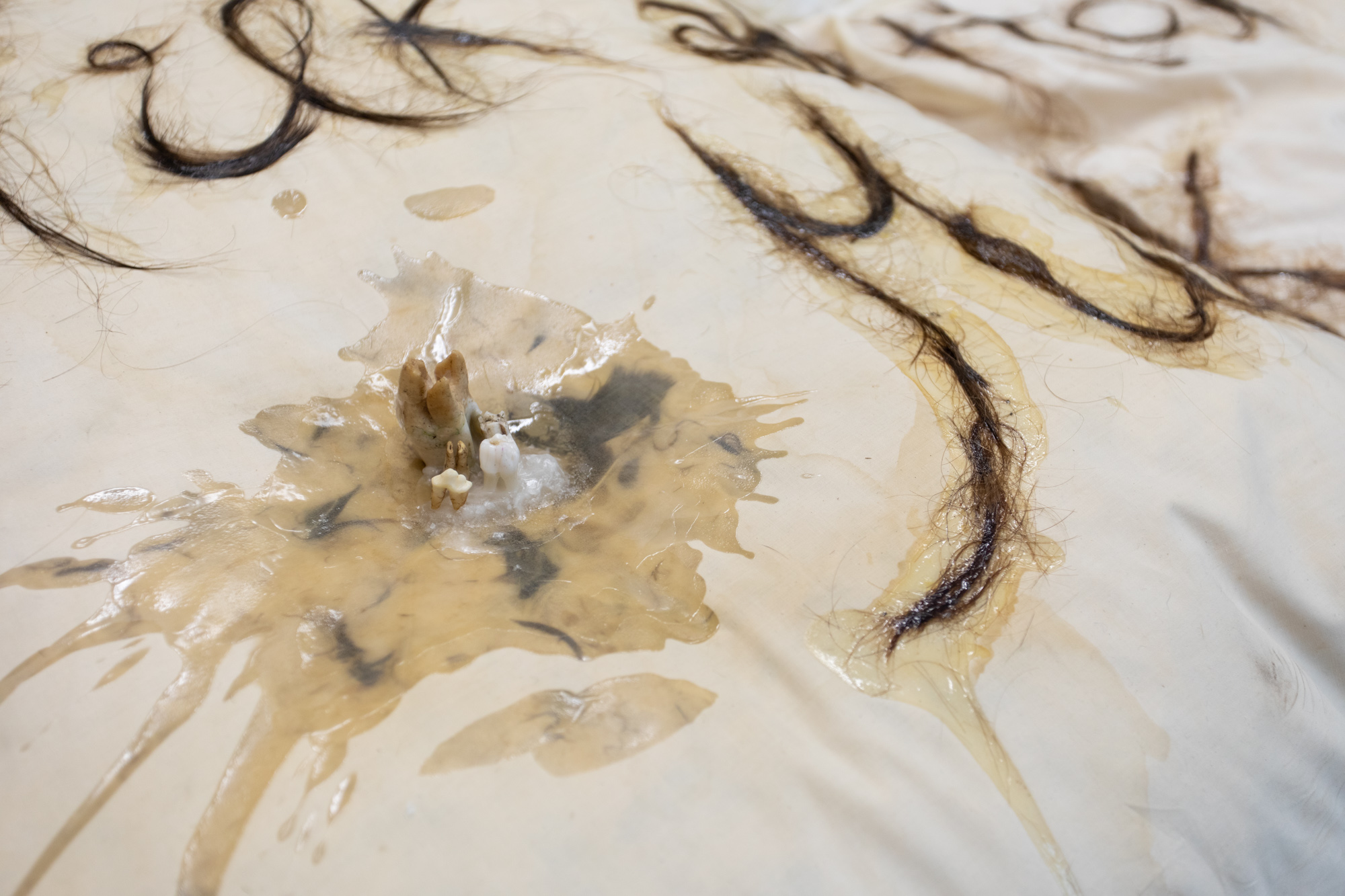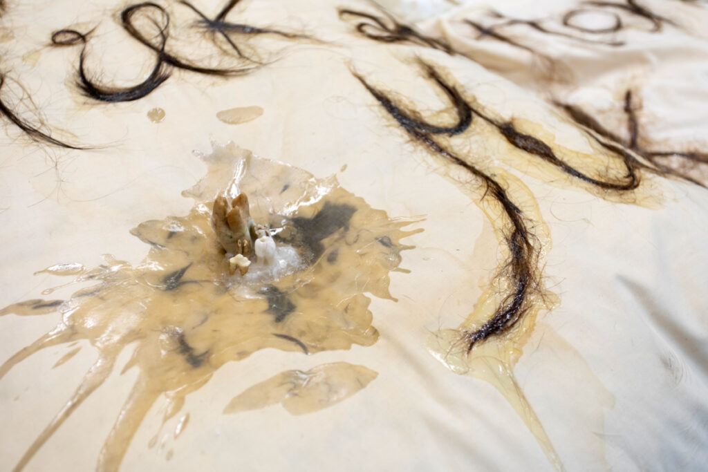 The materiality of the installation extends to its textile elements as well. Pillows, visibly worn, bear traces of prolonged use and bodily intimacy. On them, the opening sentence of the story – Once upon a time, there was Milk and Honey… – is inscribed not in ink, but with the artist’s own hair, collected over many years. Hair, as an autobiographical material and carrier of genetic information, functions as an index of personal time, loss, and change, while simultaneously serving as a symbolic extension of a body that never appears in the work yet is continuously invoked. Writing with hair recalls a lineage of women artists who have employed the body, or its remnants, as vessels of meaning – a quiet but powerful feminist gesture. Pillows and hair blend into a hybrid of the bodily and the narrative, a site where material and affective histories converge. The pillows also introduce an undercurrent of discomfort – an aversion to uncleanliness, to matter that retains the memory of breath, sweat, dreams, or anxiety. Their worn surfaces are not aesthetic flaws but a deliberately exposed tragedy of intimacy, its shadowy and unglamorous side. Combined with the hair and teeth – materials that anthropologists might describe as biographical remains or fragments of bodily archaeology – the installation takes on the character of an internal archive. These materials, once belonging to a living body, are now extracted and displayed as evidence of physical and psychological processes, as inanimate witnesses to what the body has experienced, endured, or repressed. This interplay of intimacy and revulsion, of the abject and the affective, heightens the psychological tension of the show, causing the entire mise-en-scène to breathe with the unease of a place where childhood, as already noted, appears not only as a realm of play but also as the cradle of future fractures, fears, and defensive mechanisms. Indeed, every element in the compact gallery space can be read as a stage prop of an absent performance, traces of an implied act of discomfort that has already occurred or will soon continue.