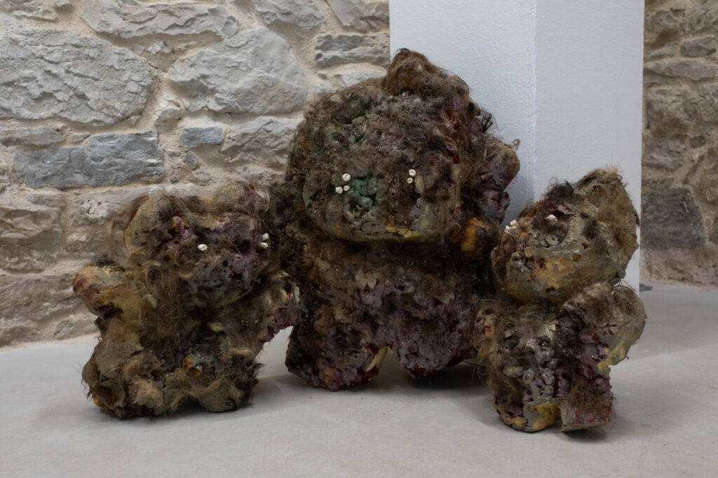 The exhibition thus speaks not only of childhood, but of growing up as a process of reinterpreting myths, of re-encountering figures that shaped the imagination but now appear in a darker and more complex light. In a sense it enacts a subtle perversion of the fairy tale, a genre that offers comfort in childhood, but in adulthood becomes a site of confrontation with fears that never disappeared but merely changed shape. What was once sweet now becomes a weapon; what was gentle becomes strategy; what was hidden is now performatively revealed. This reversal is the central point of the exhibition – the ability to transform everyday objects and traces of biological life into metaphors of inner struggle, and children’s stories into a field of aesthetic and psychological resistance. After all, nothing in childhood is ever entirely innocent. (text: Dalibor Prančević)