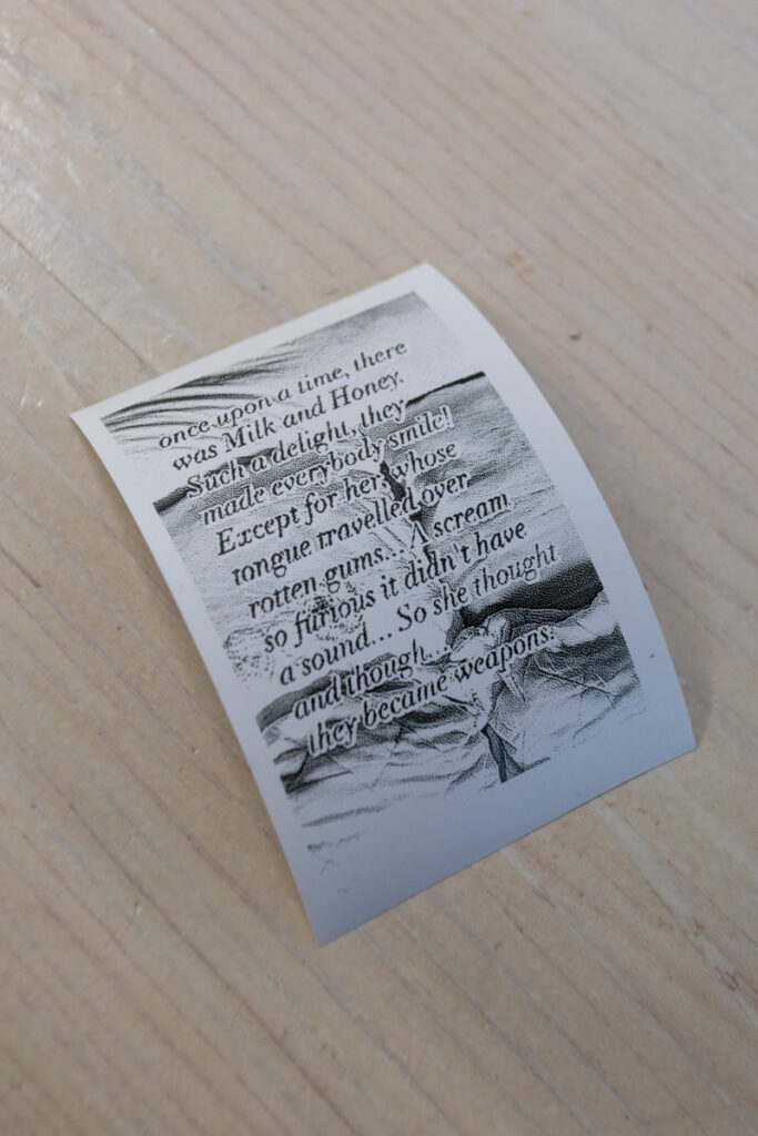 The story underlying the exhibition begins with the familiar formula: Once upon a time, there was Milk and Honey. Such a delight, they made everybody smile! Yet what follows departs from convention. Instead of sweet innocence, a vast crack appears: Except for her, whose tongue travelled over rotten gums… A scream so furious it didn’t have a sound… So she thought and thought… they became weapons. This abrupt shift – from milk and honey to decay, suppressed pain, and rage – is a crucial interpretative pivot. What once symbolized comfort becomes a thing of revulsion and resistance; what was intimate and friendly to children, in Nardini’s interpretation, turns into weapons and unease. In the fantasy world of childhood, where anything is possible, Nardini locates a metaphor of psychological self-defense, a mechanism in which the fantastic is recast into an instrument of strength, as well as a signal that childhood is not only a paradise lost but also the source of future fractures and vulnerabilities.